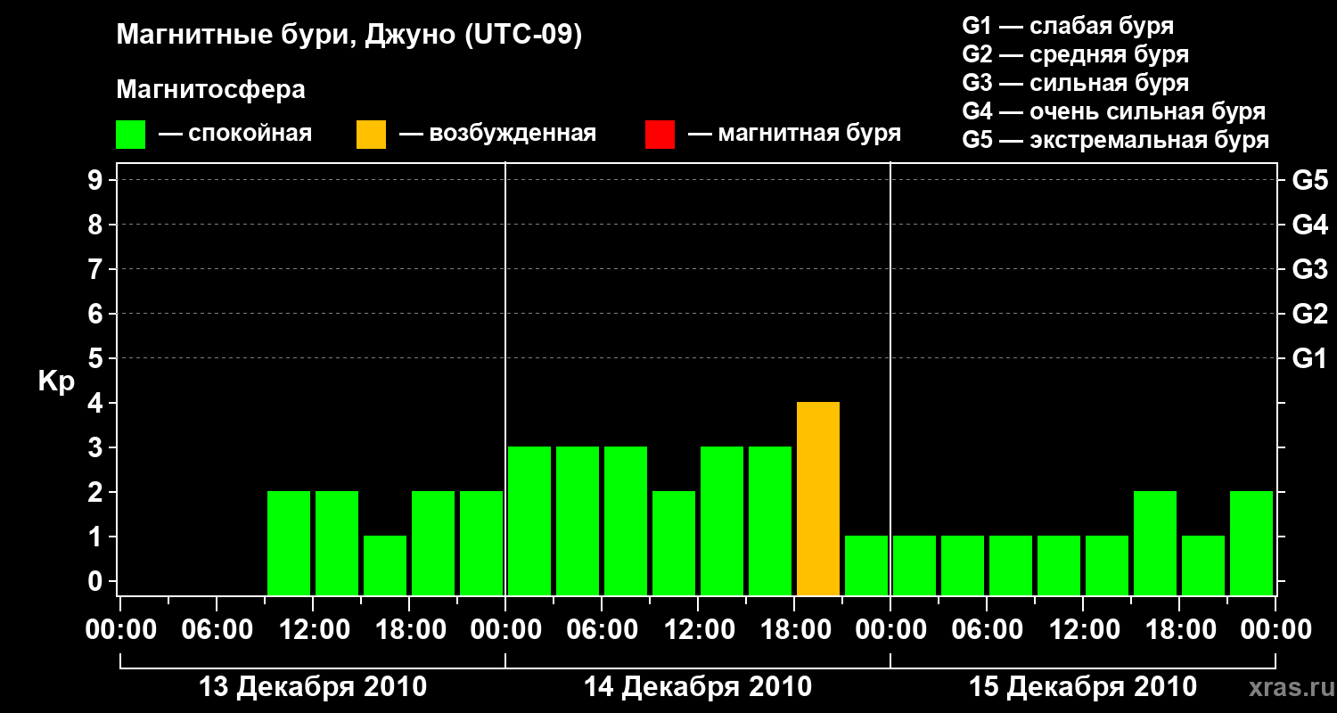 Изменения геомагнитного индекса Kp с 13 по 15 декабря 2010 года для средних широт