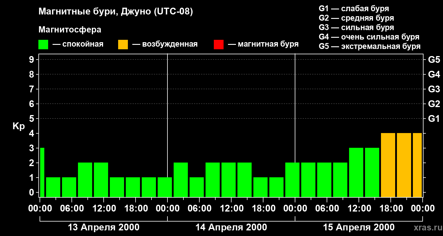 Изменения геомагнитного индекса Kp с 13 по 15 апреля 2000 года для средних широт