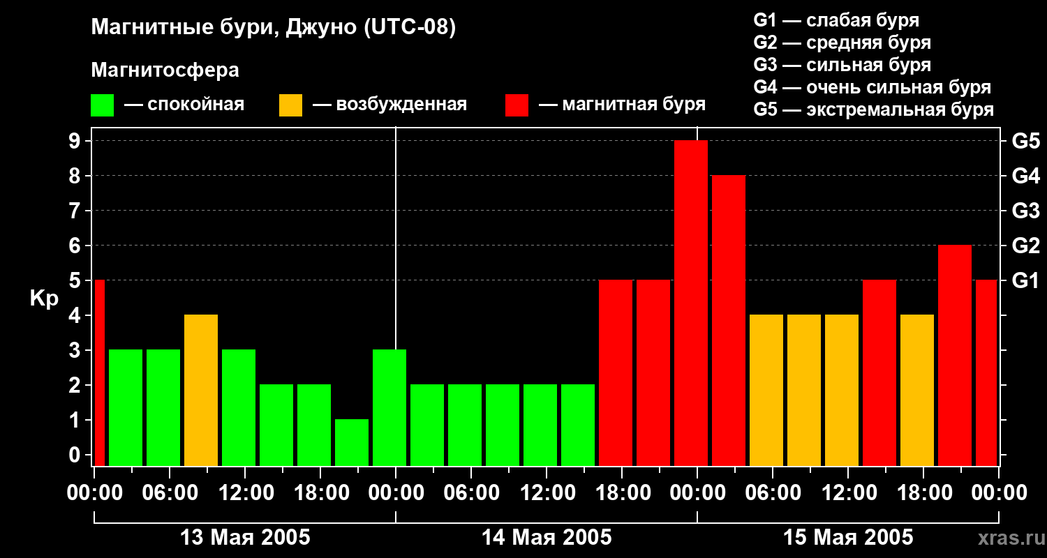 Изменения геомагнитного индекса Kp с 13 по 15 мая 2005 года для средних широт