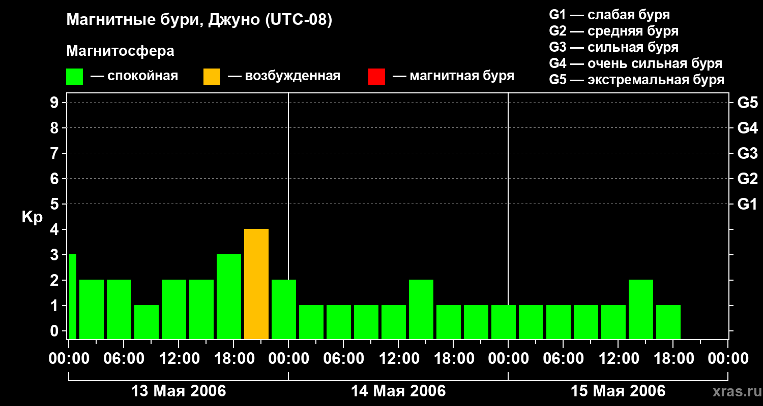 Изменения геомагнитного индекса Kp с 13 по 15 мая 2006 года для средних широт