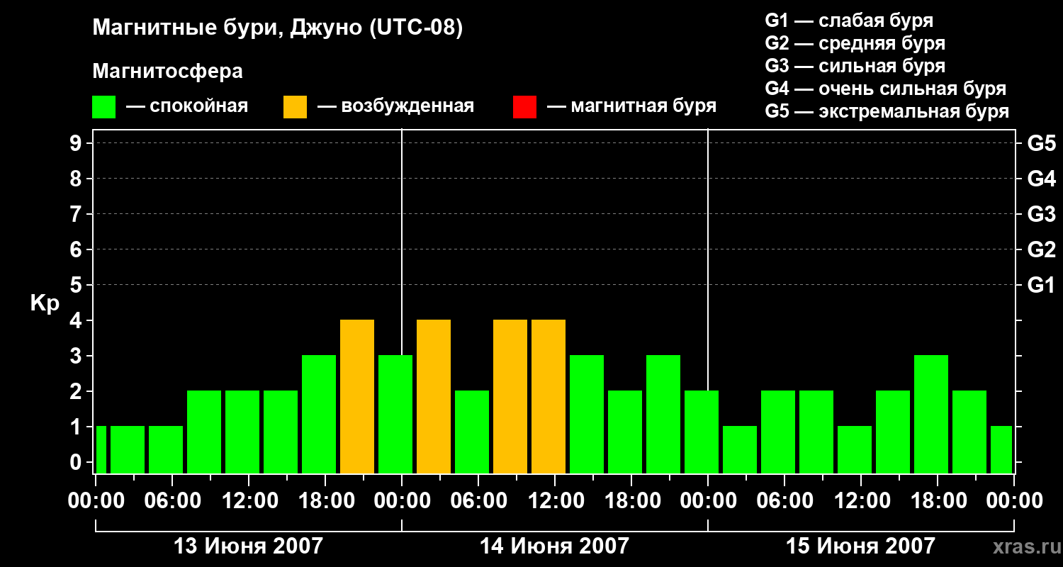Изменения геомагнитного индекса Kp с 13 по 15 июня 2007 года для средних широт