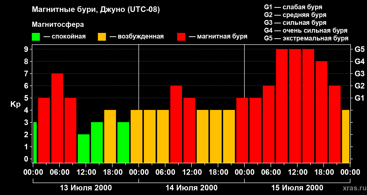 Изменения геомагнитного индекса Kp с 13 по 15 июля 2000 года для средних широт