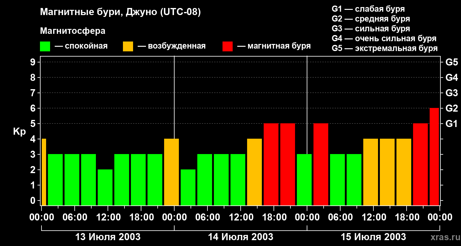 Изменения геомагнитного индекса Kp с 13 по 15 июля 2003 года для средних широт