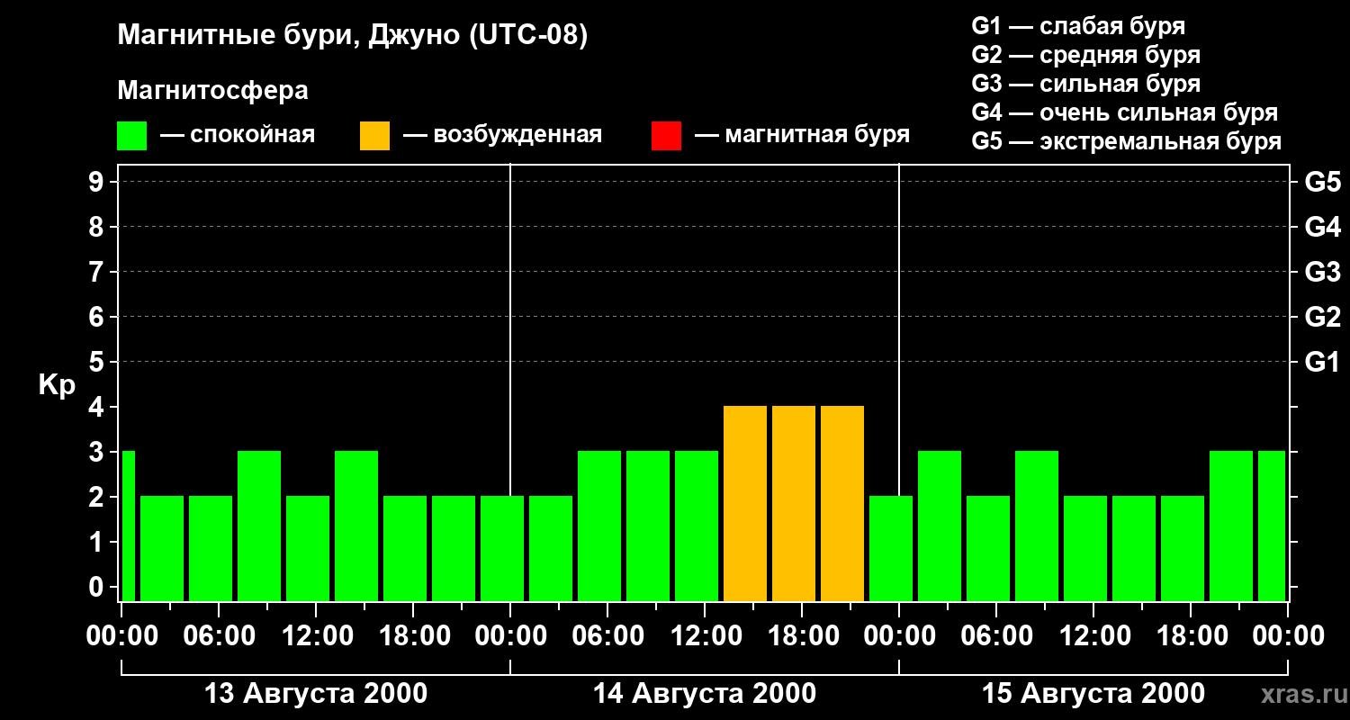 Изменения геомагнитного индекса Kp с 13 по 15 августа 2000 года для средних широт