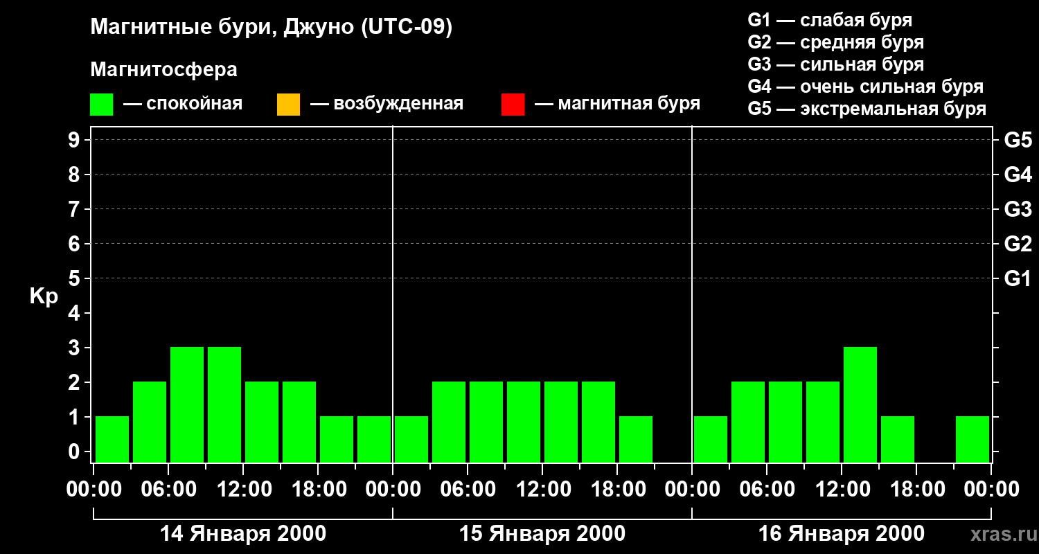 Изменения геомагнитного индекса Kp с 14 по 16 января 2000 года для средних широт