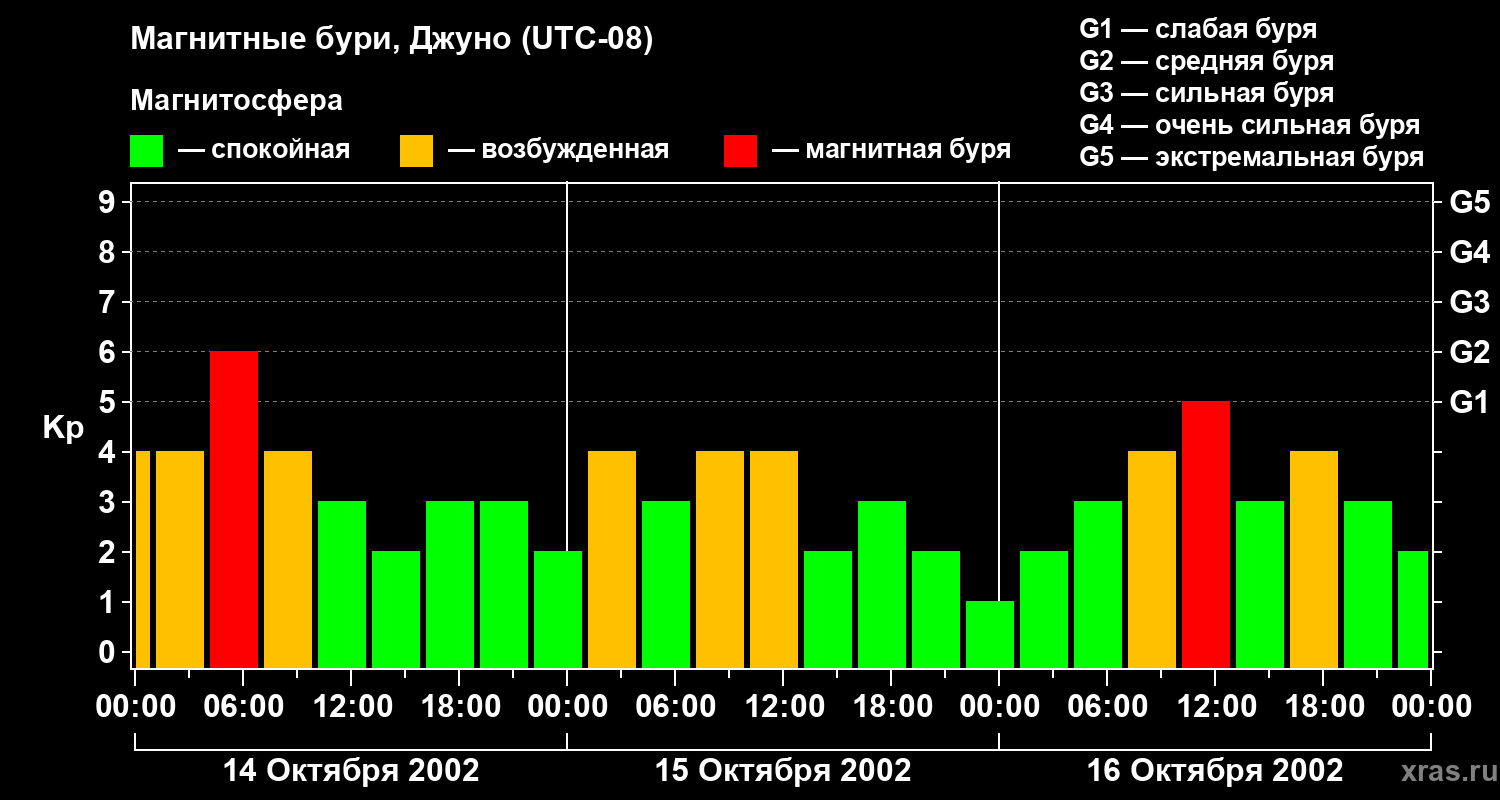 Изменения геомагнитного индекса Kp с 14 по 16 октября 2002 года для средних широт