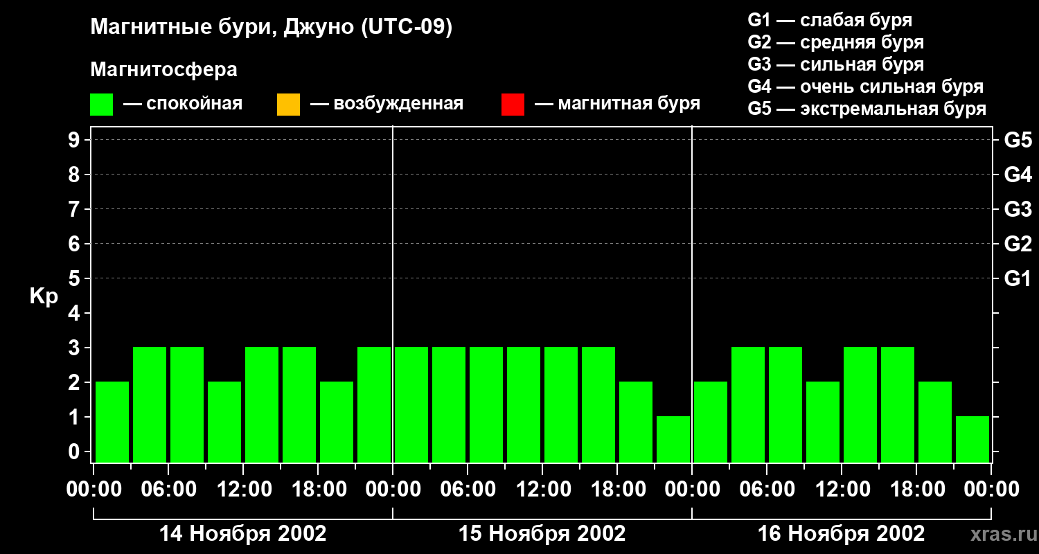 Изменения геомагнитного индекса Kp с 14 по 16 ноября 2002 года для средних широт