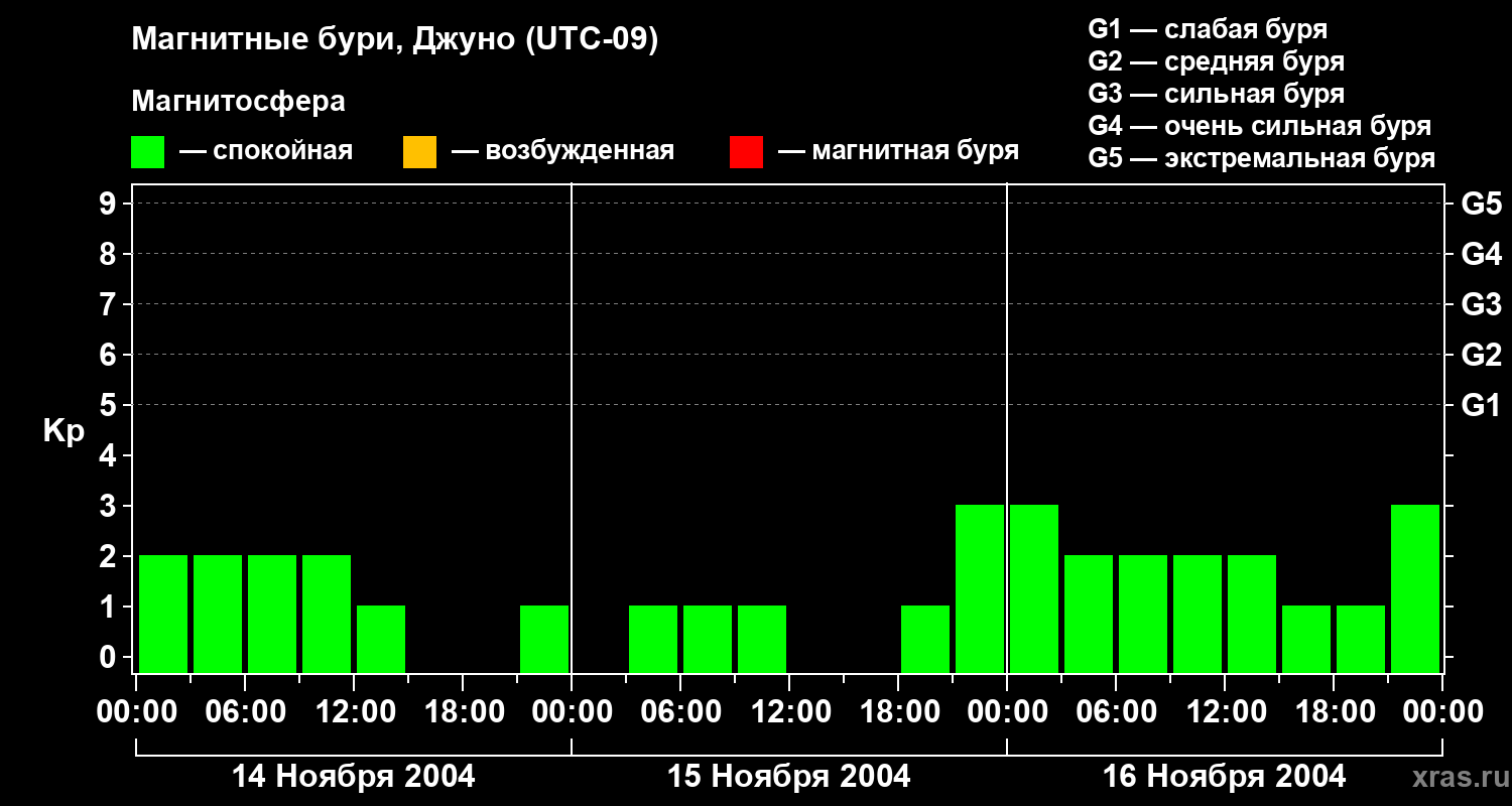 Изменения геомагнитного индекса Kp с 14 по 16 ноября 2004 года для средних широт