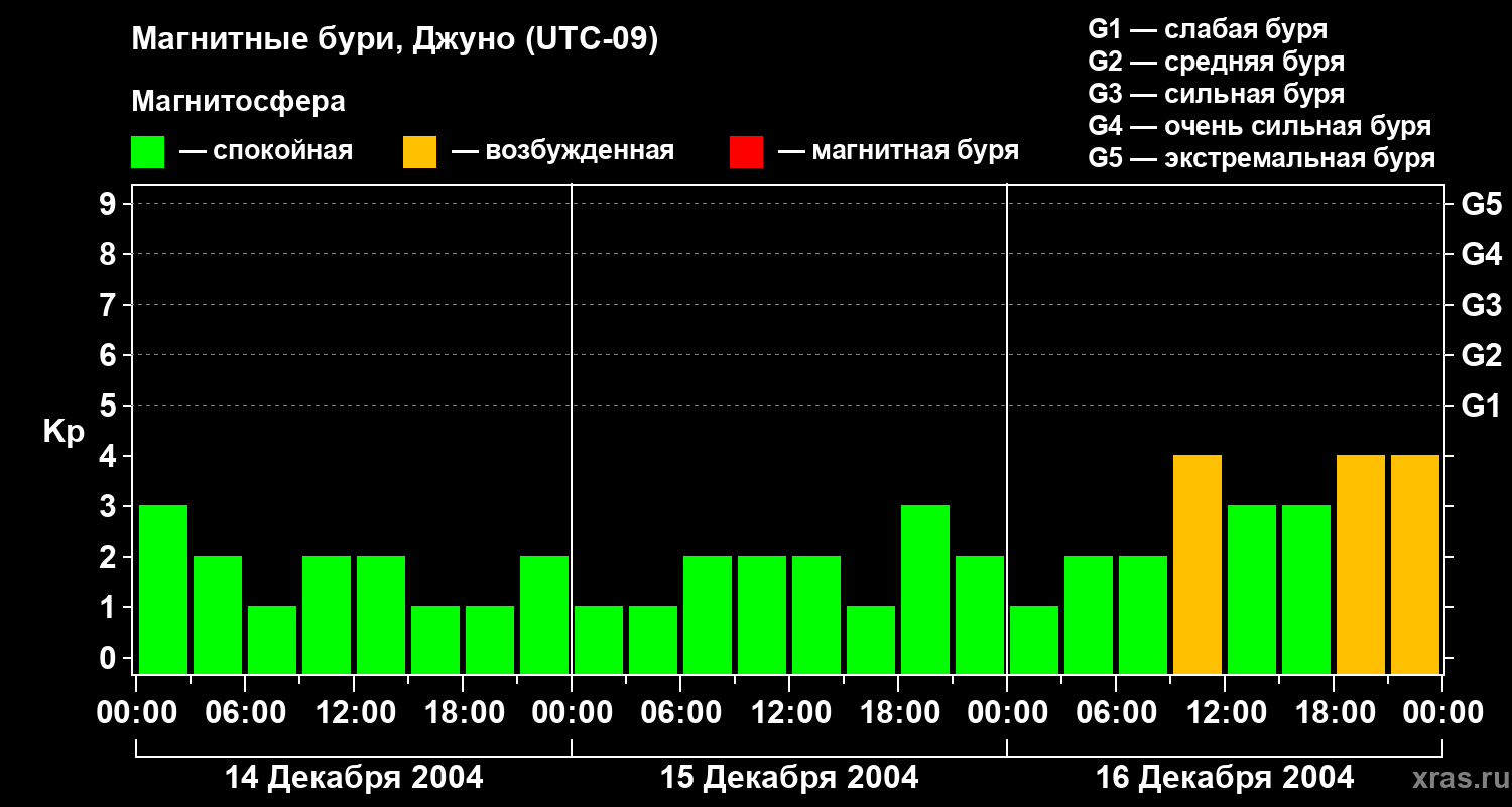 Изменения геомагнитного индекса Kp с 14 по 16 декабря 2004 года для средних широт
