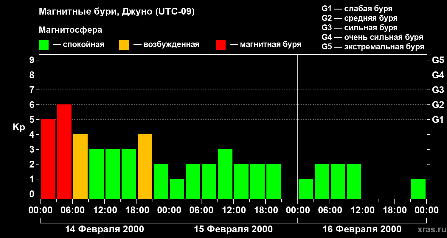 Изменения геомагнитного индекса Kp с 14 по 16 февраля 2000 года для средних широт