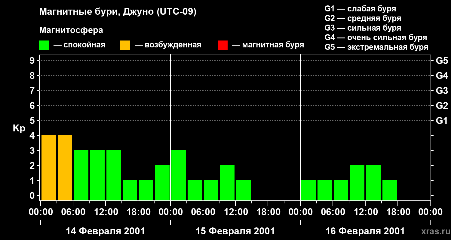 Изменения геомагнитного индекса Kp с 14 по 16 февраля 2001 года для средних широт