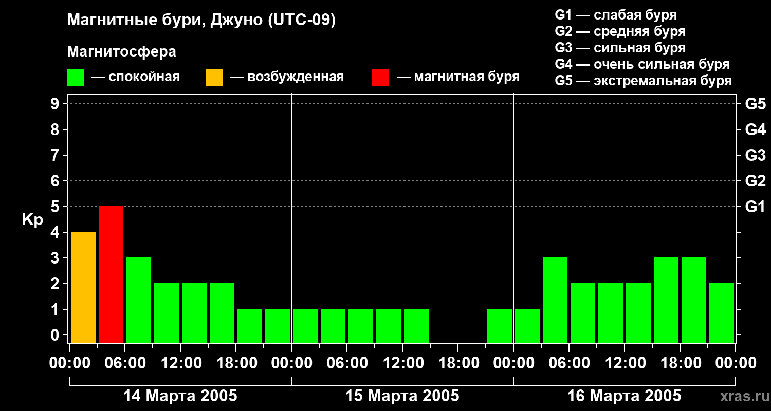 Изменения геомагнитного индекса Kp с 14 по 16 марта 2005 года для средних широт