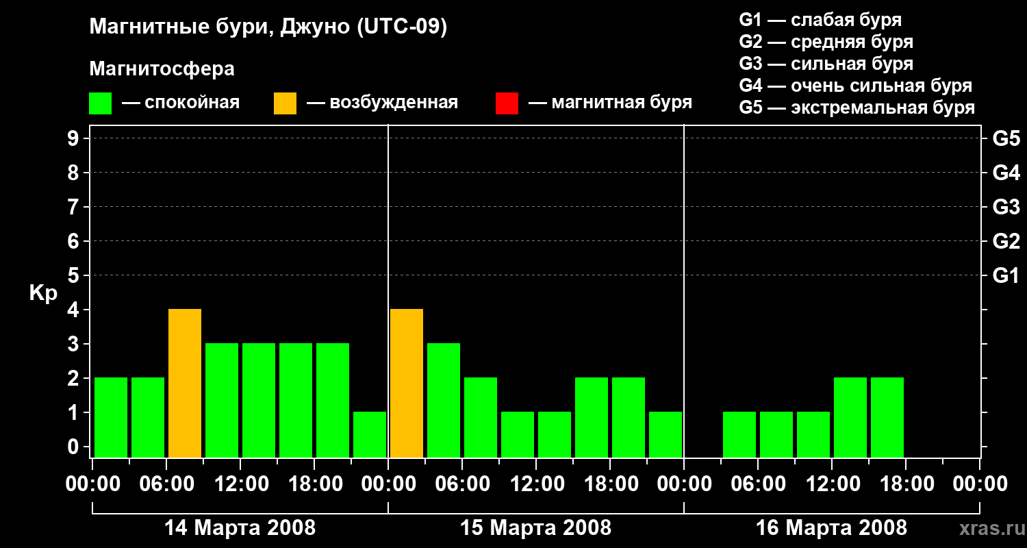 Изменения геомагнитного индекса Kp с 14 по 16 марта 2008 года для средних широт