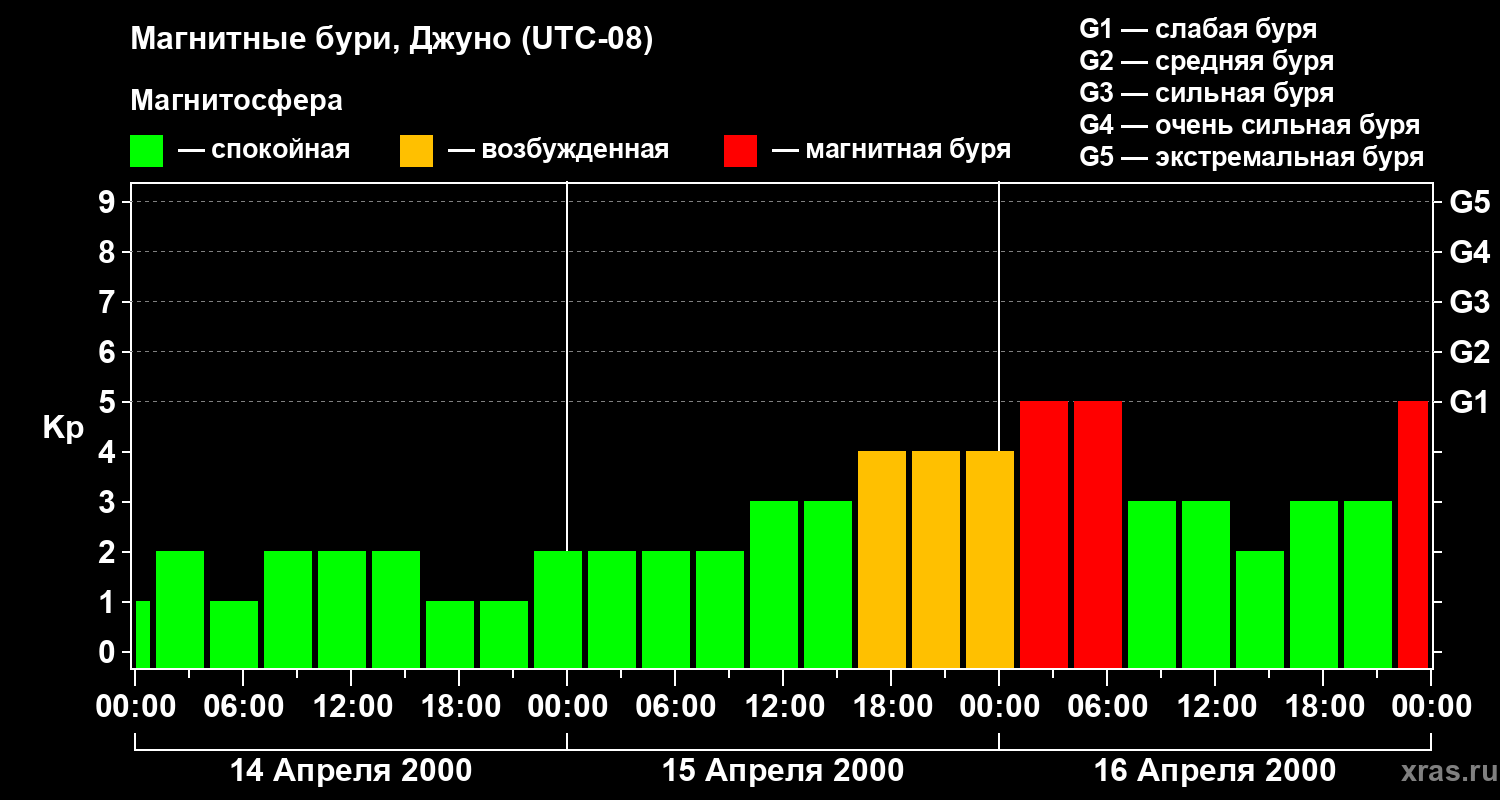 Изменения геомагнитного индекса Kp с 14 по 16 апреля 2000 года для средних широт