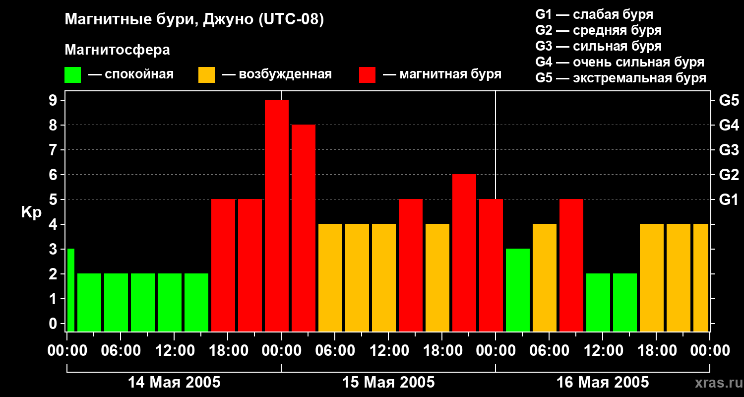 Изменения геомагнитного индекса Kp с 14 по 16 мая 2005 года для средних широт