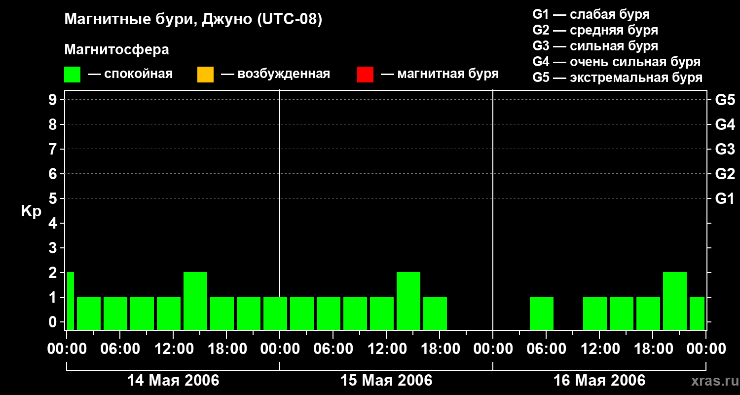 Изменения геомагнитного индекса Kp с 14 по 16 мая 2006 года для средних широт