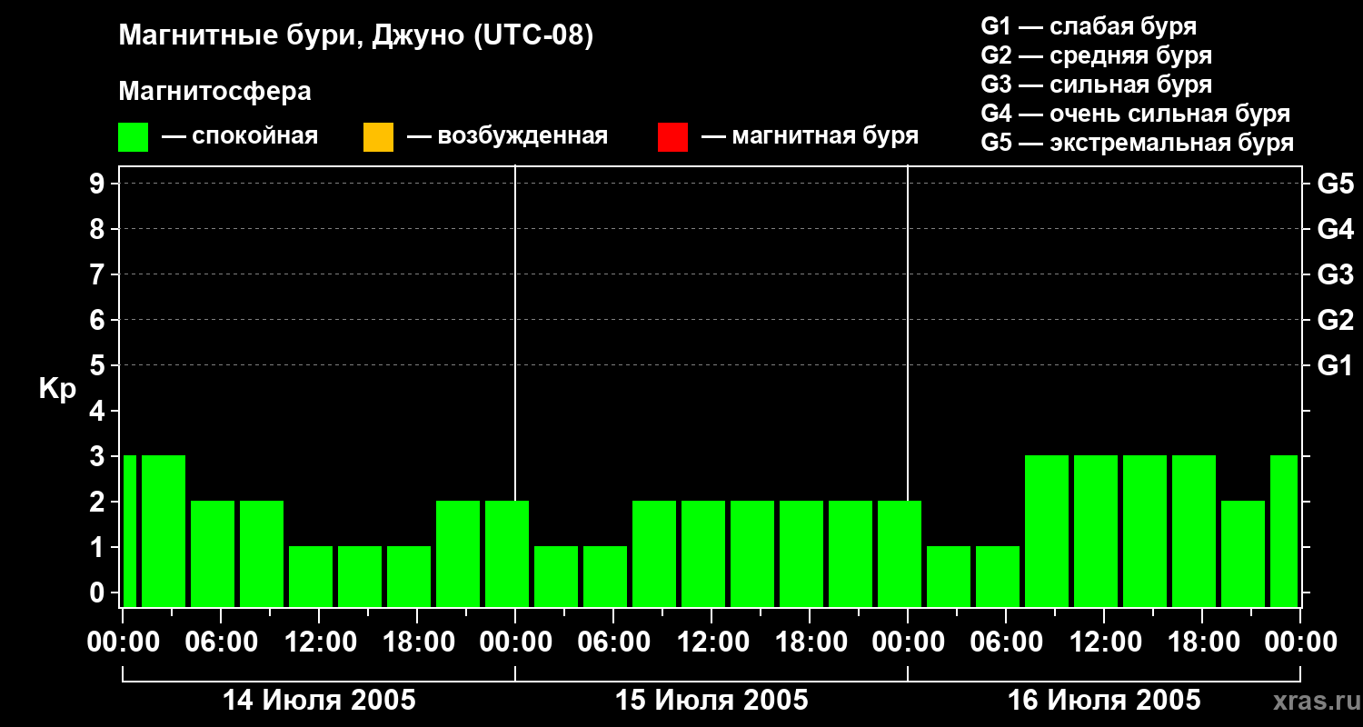 Изменения геомагнитного индекса Kp с 14 по 16 июля 2005 года для средних широт