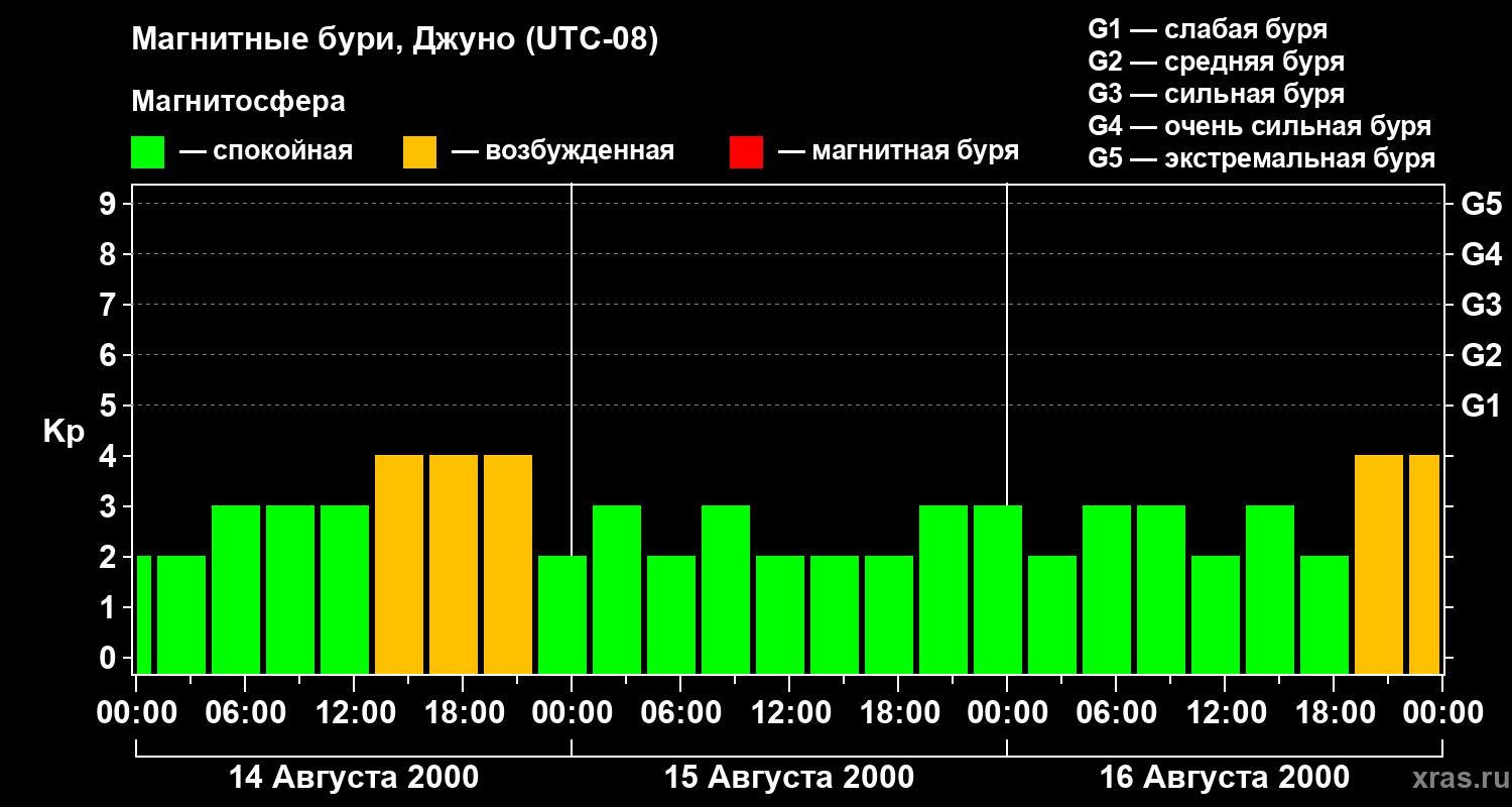 Изменения геомагнитного индекса Kp с 14 по 16 августа 2000 года для средних широт
