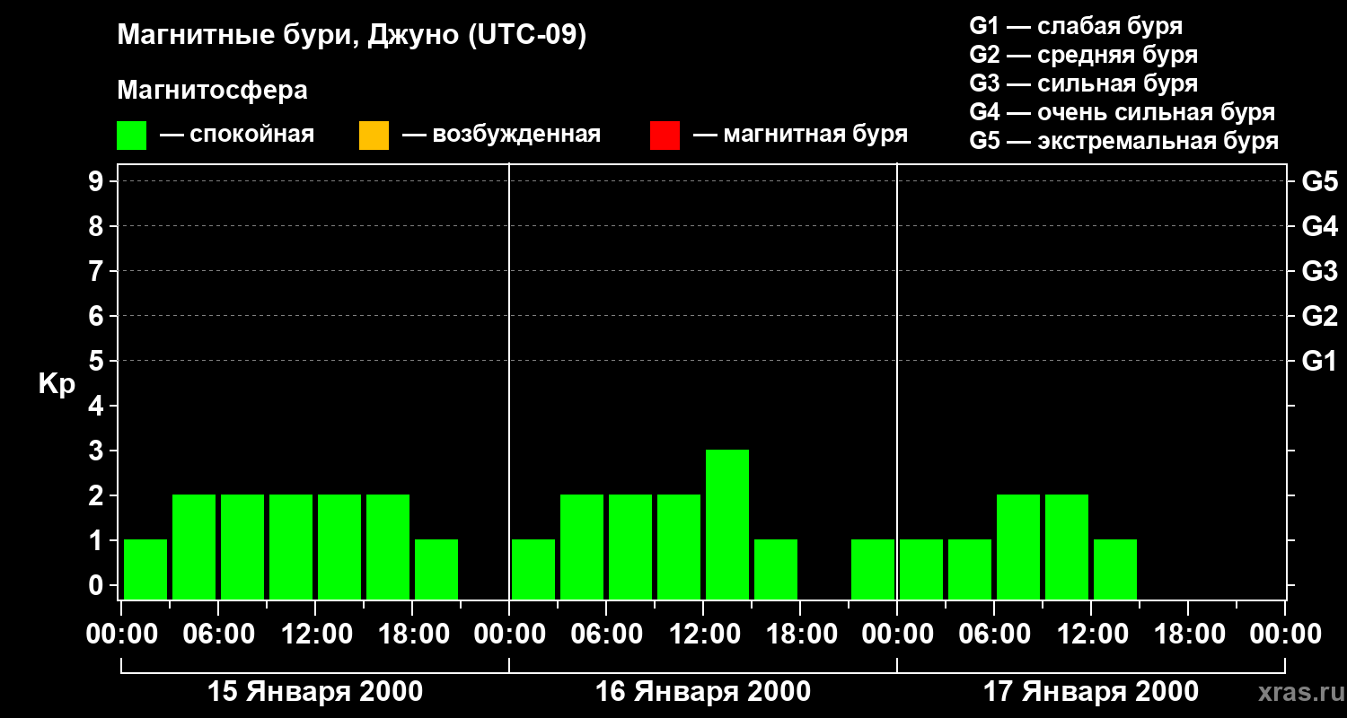 Изменения геомагнитного индекса Kp с 15 по 17 января 2000 года для средних широт