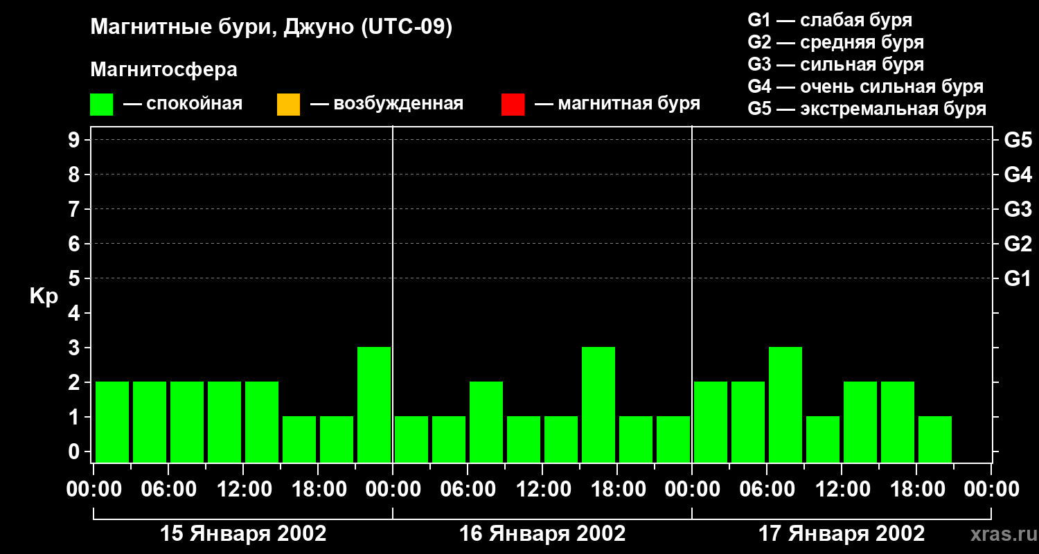 Изменения геомагнитного индекса Kp с 15 по 17 января 2002 года для средних широт