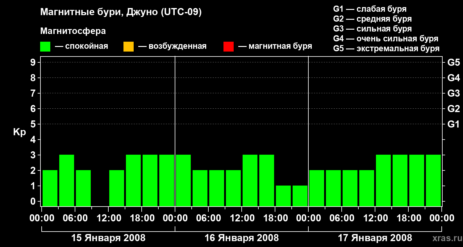 Изменения геомагнитного индекса Kp с 15 по 17 января 2008 года для средних широт