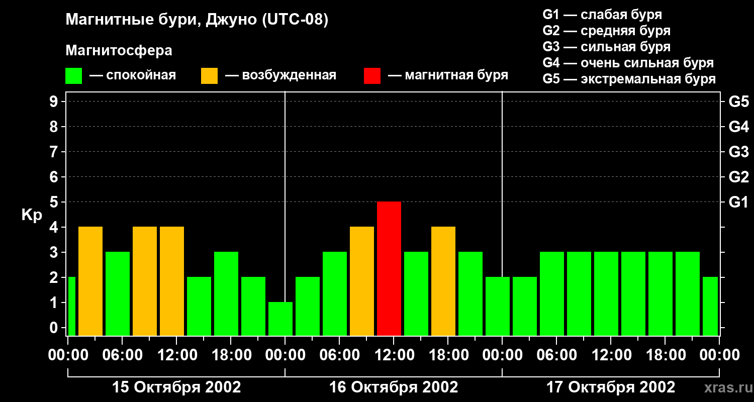 Изменения геомагнитного индекса Kp с 15 по 17 октября 2002 года для средних широт