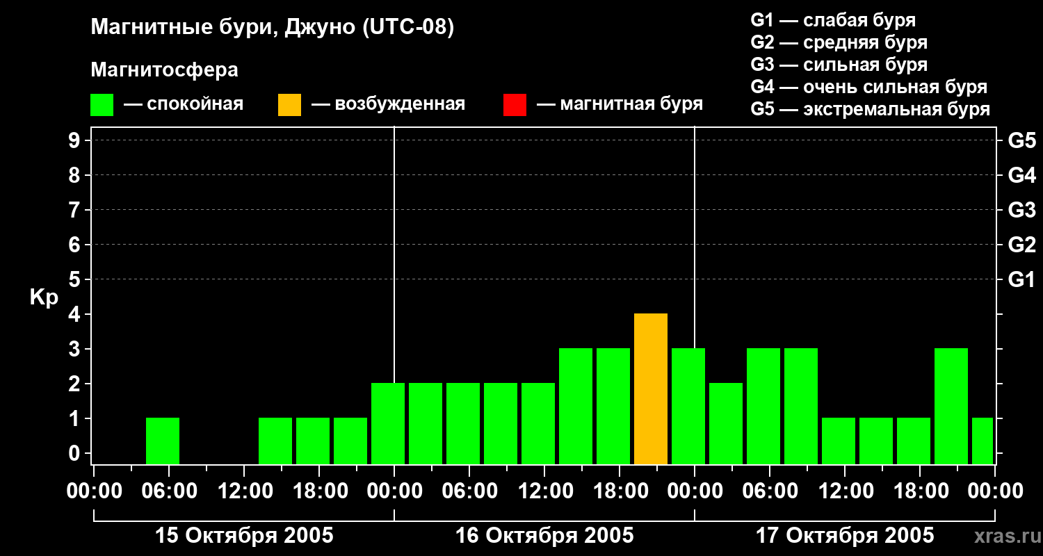 Изменения геомагнитного индекса Kp с 15 по 17 октября 2005 года для средних широт