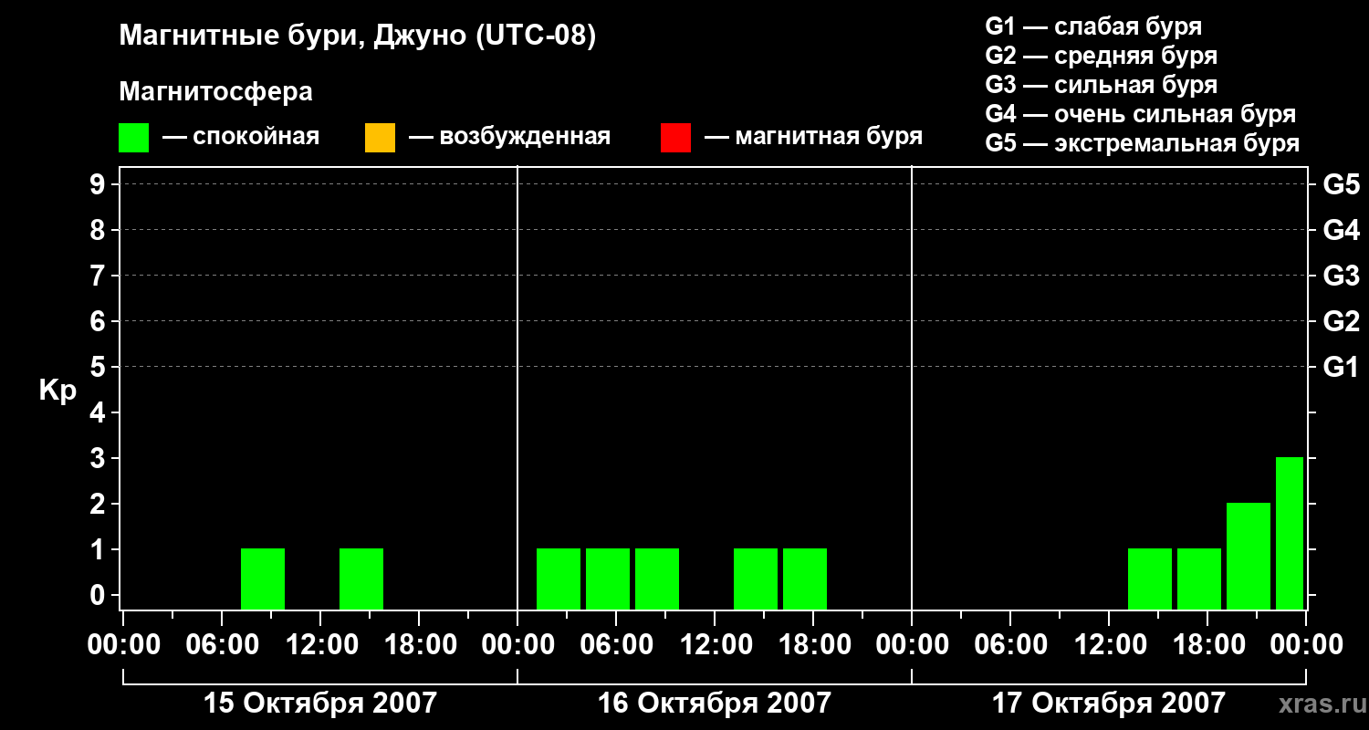 Изменения геомагнитного индекса Kp с 15 по 17 октября 2007 года для средних широт