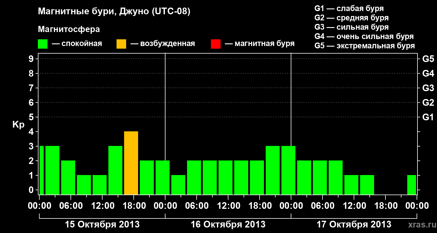 Изменения геомагнитного индекса Kp с 15 по 17 октября 2013 года для средних широт