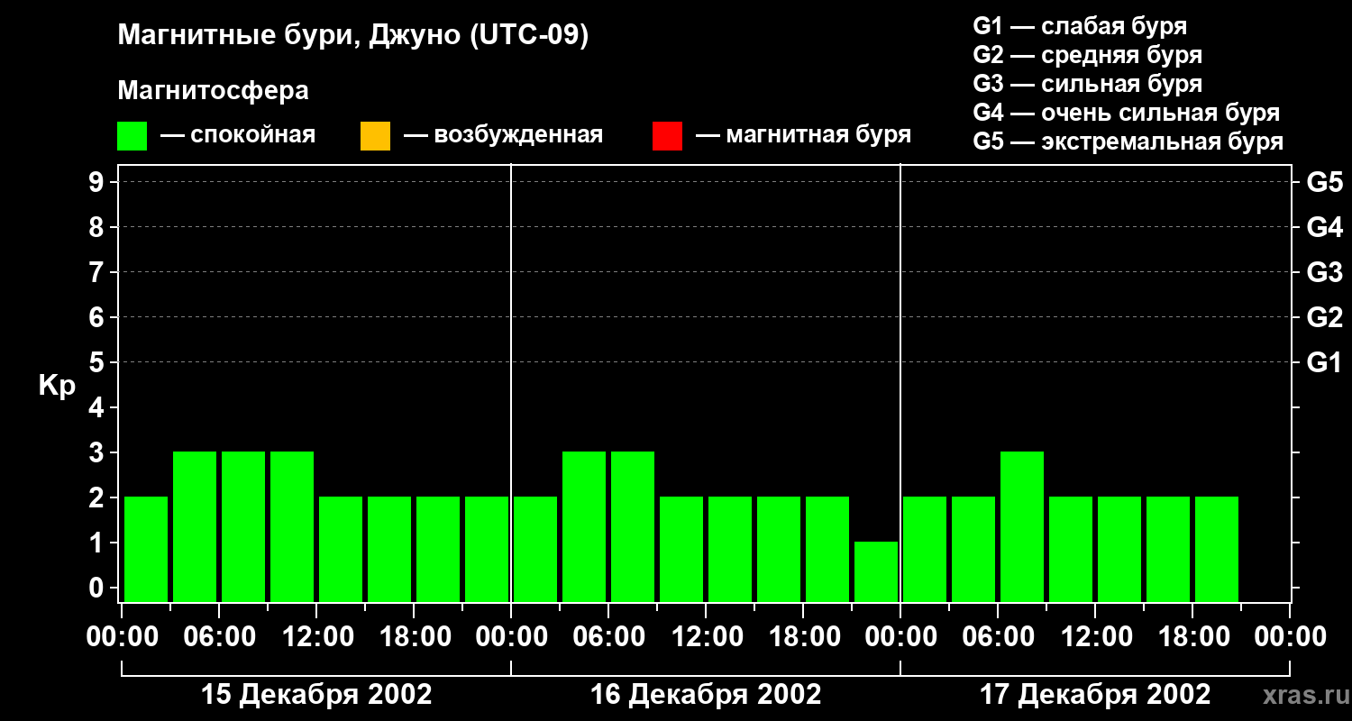 Изменения геомагнитного индекса Kp с 15 по 17 декабря 2002 года для средних широт