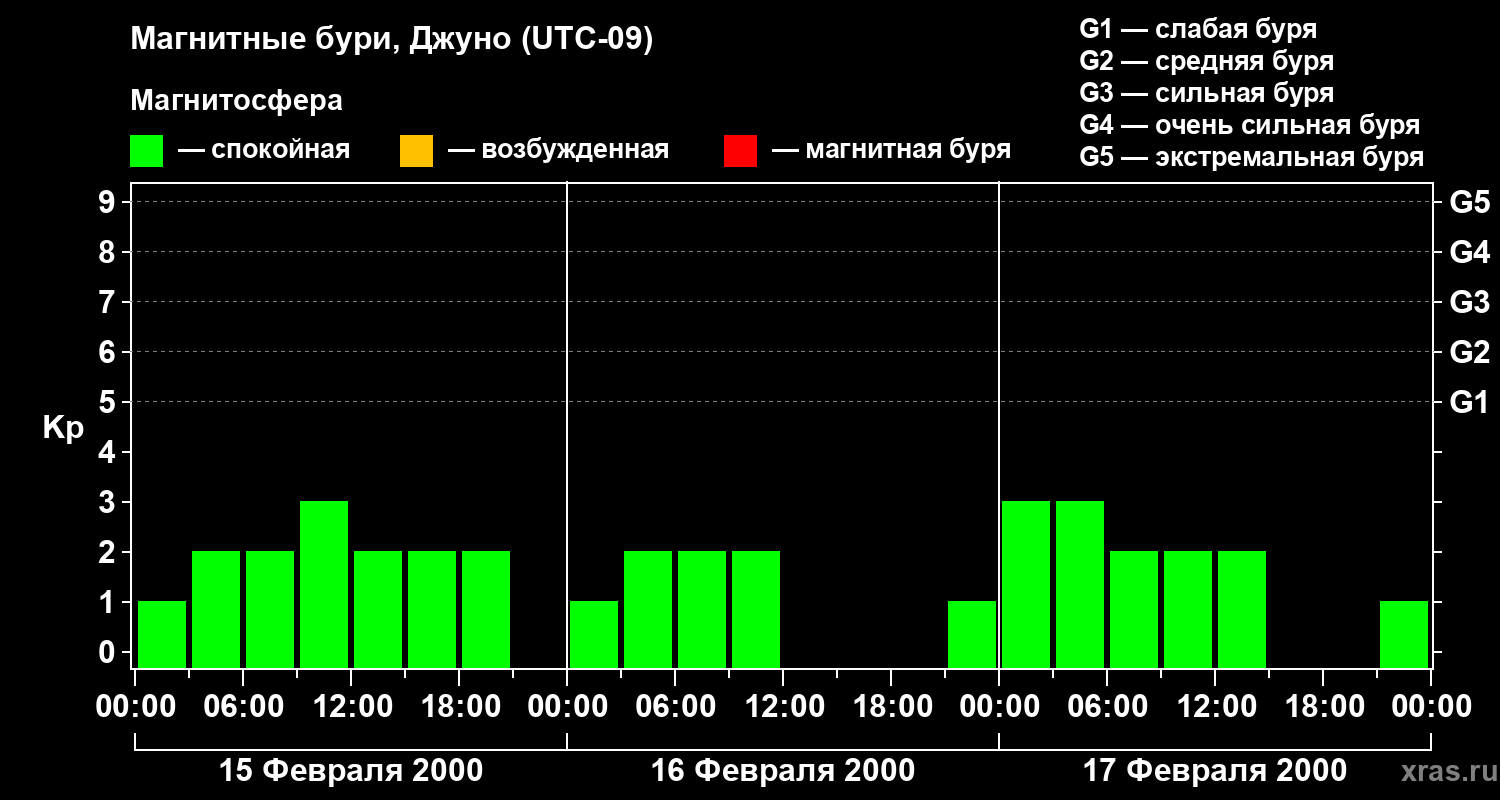 Изменения геомагнитного индекса Kp с 15 по 17 февраля 2000 года для средних широт
