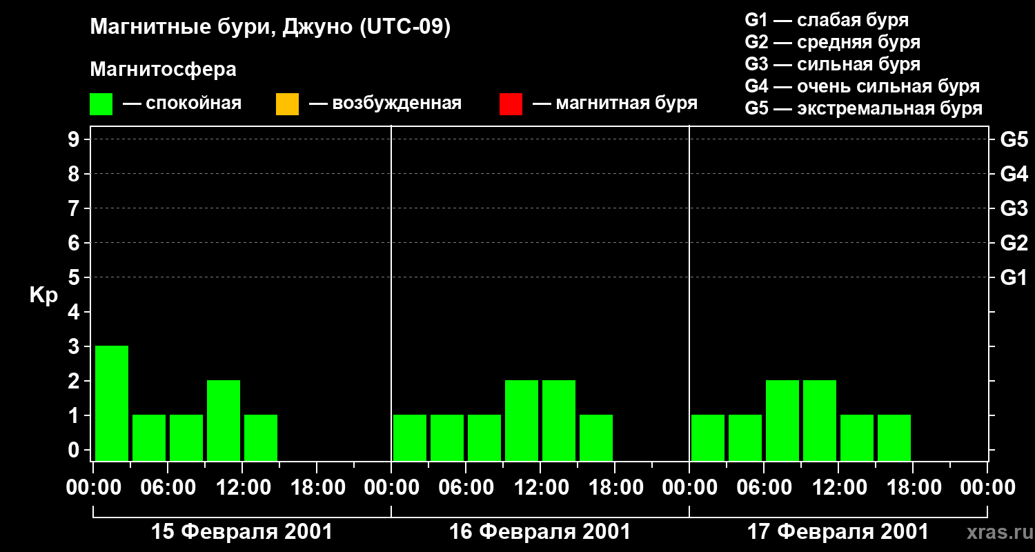 Изменения геомагнитного индекса Kp с 15 по 17 февраля 2001 года для средних широт