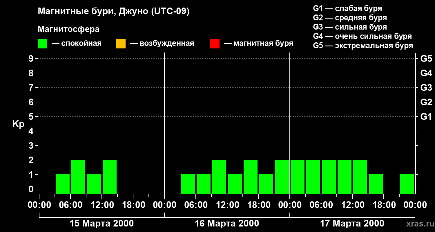 Изменения геомагнитного индекса Kp с 15 по 17 марта 2000 года для средних широт
