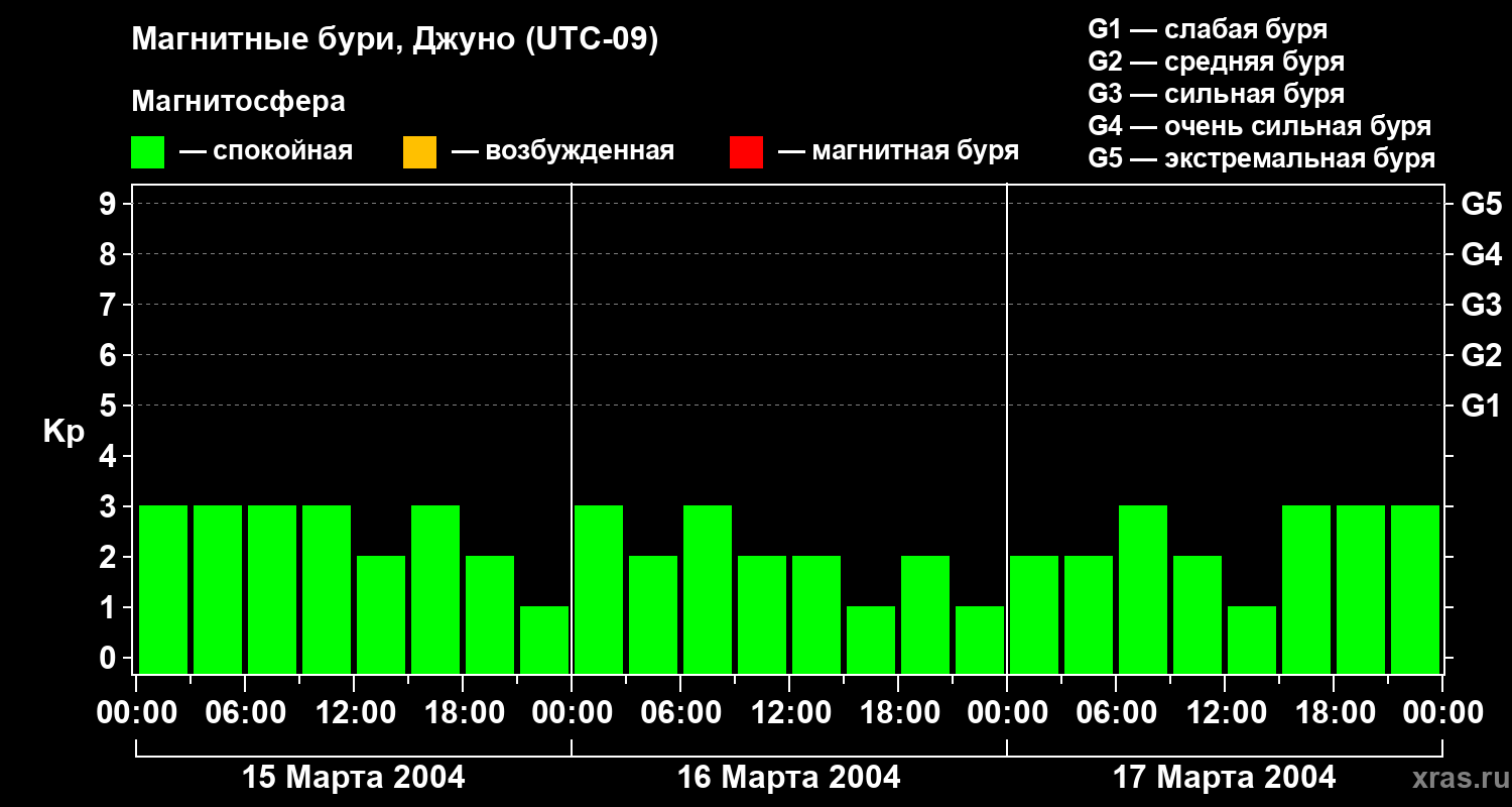 Изменения геомагнитного индекса Kp с 15 по 17 марта 2004 года для средних широт