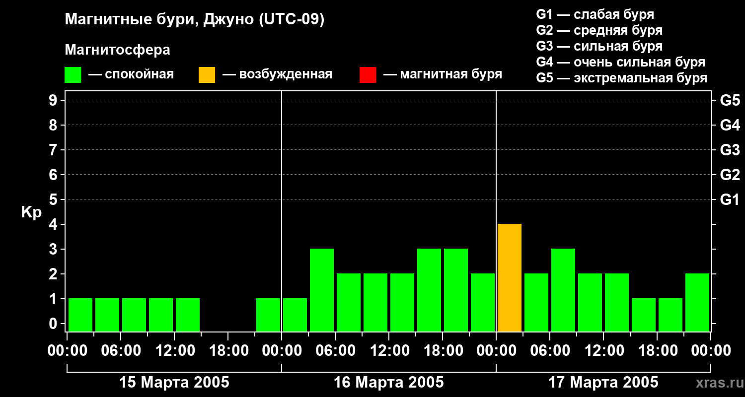 Изменения геомагнитного индекса Kp с 15 по 17 марта 2005 года для средних широт