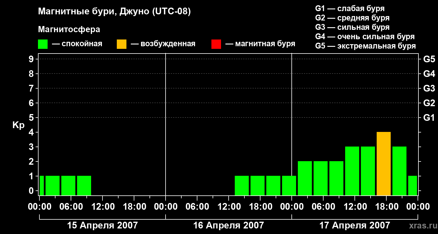 Изменения геомагнитного индекса Kp с 15 по 17 апреля 2007 года для средних широт