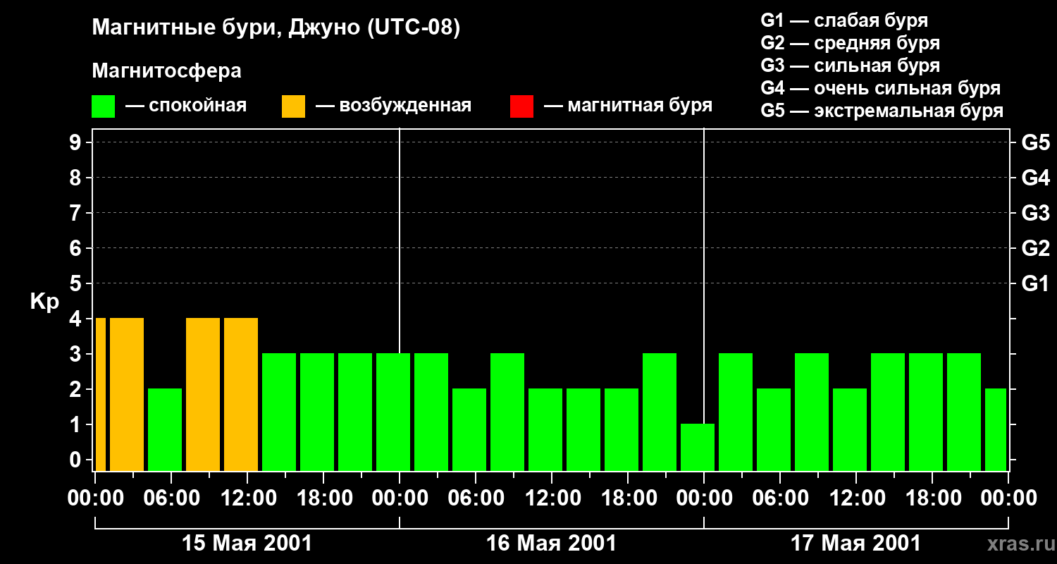 Изменения геомагнитного индекса Kp с 15 по 17 мая 2001 года для средних широт