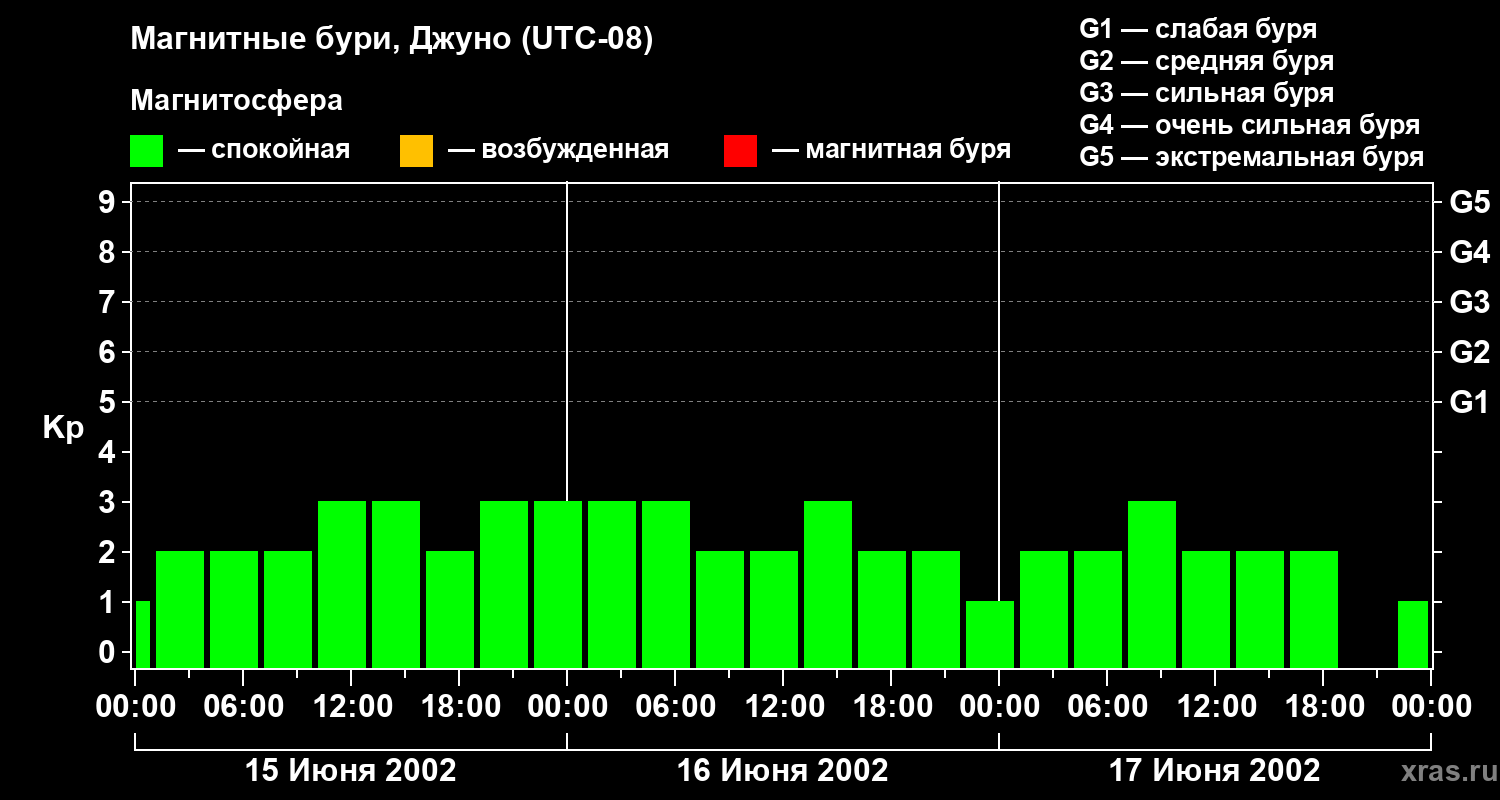 Изменения геомагнитного индекса Kp с 15 по 17 июня 2002 года для средних широт