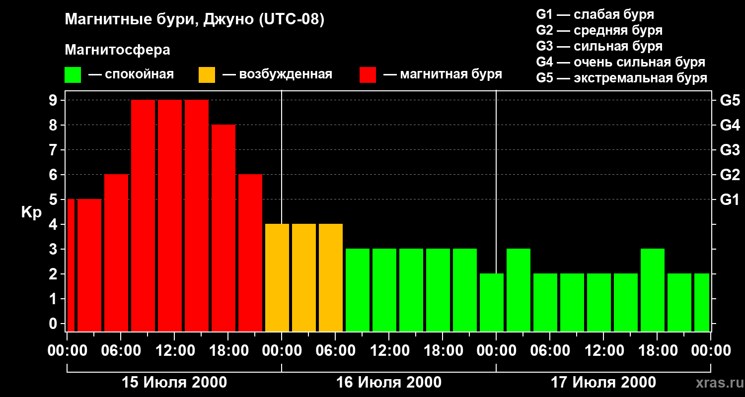 Изменения геомагнитного индекса Kp с 15 по 17 июля 2000 года для средних широт