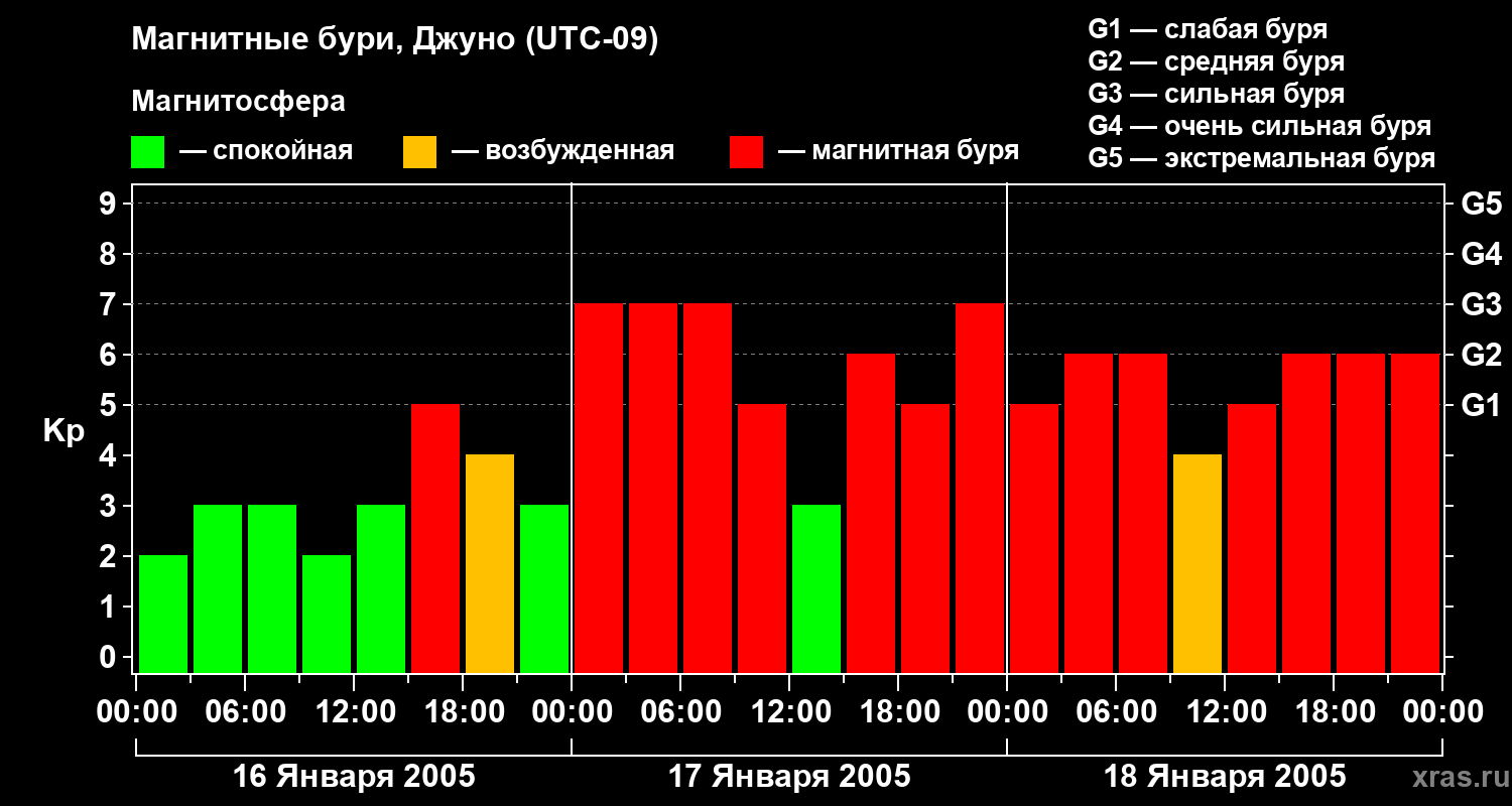 Изменения геомагнитного индекса Kp с 16 по 18 января 2005 года для средних широт