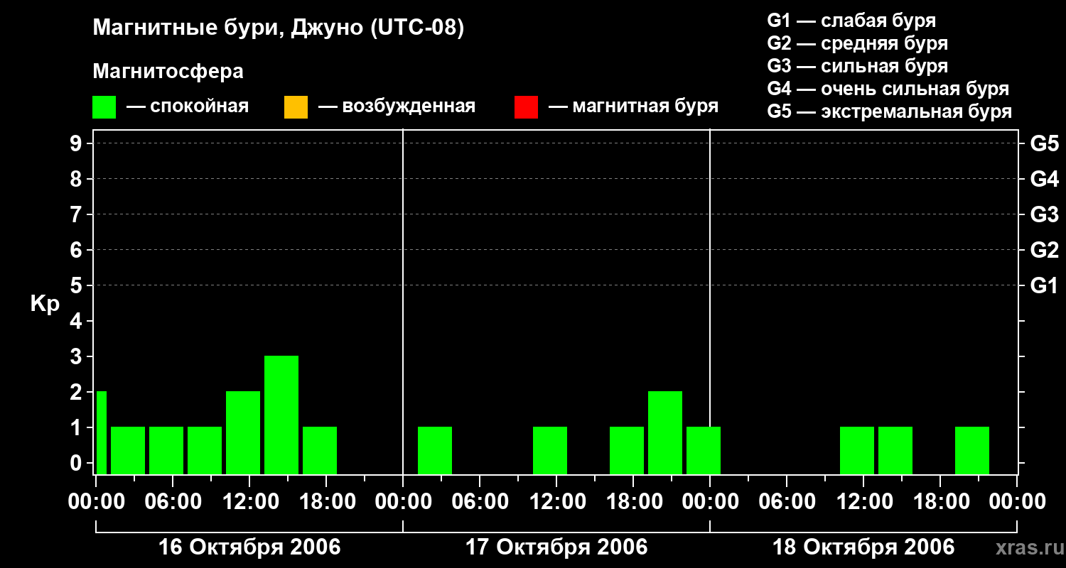 Изменения геомагнитного индекса Kp с 16 по 18 октября 2006 года для средних широт