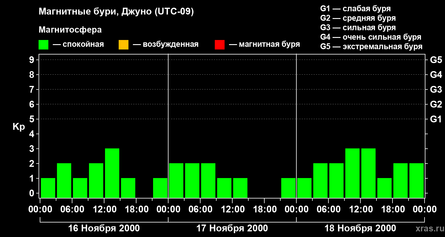 Изменения геомагнитного индекса Kp с 16 по 18 ноября 2000 года для средних широт