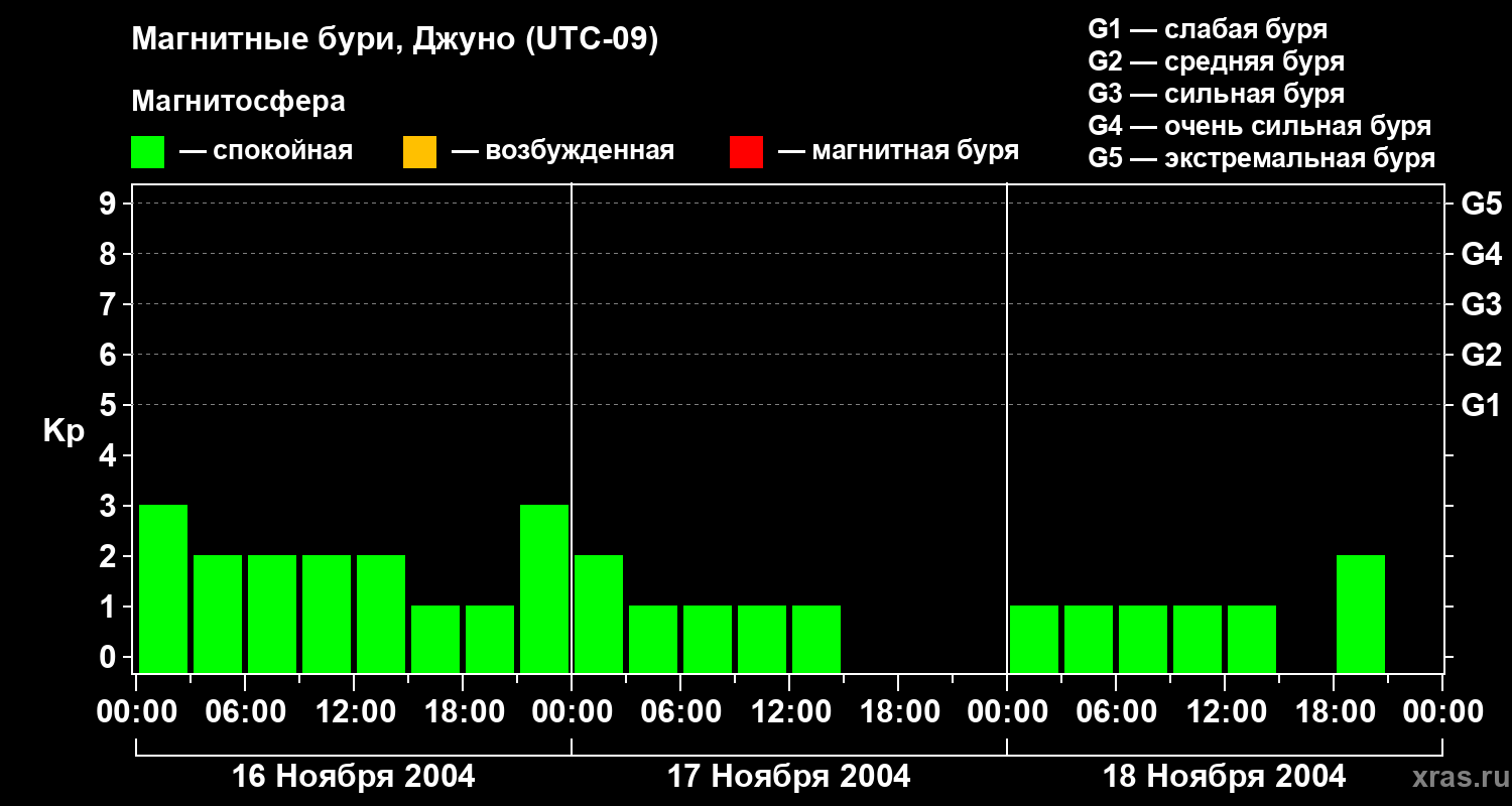 Изменения геомагнитного индекса Kp с 16 по 18 ноября 2004 года для средних широт