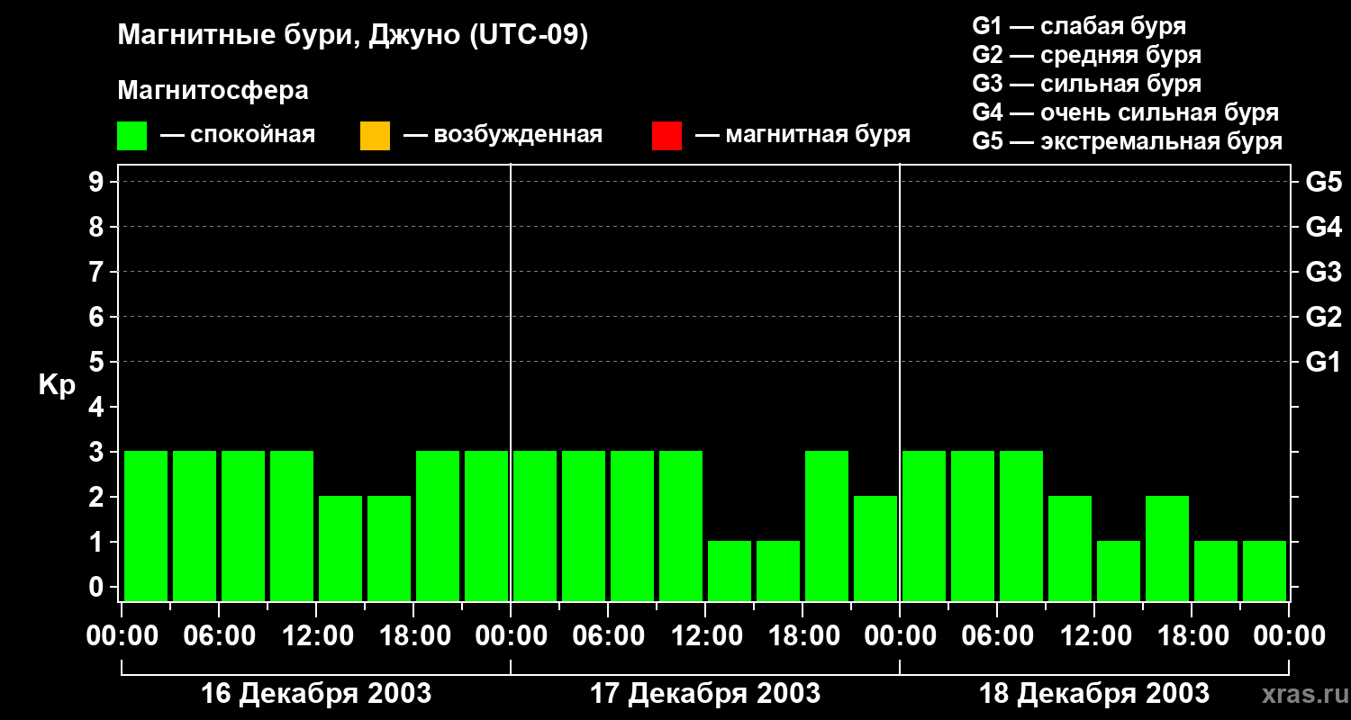 Изменения геомагнитного индекса Kp с 16 по 18 декабря 2003 года для средних широт