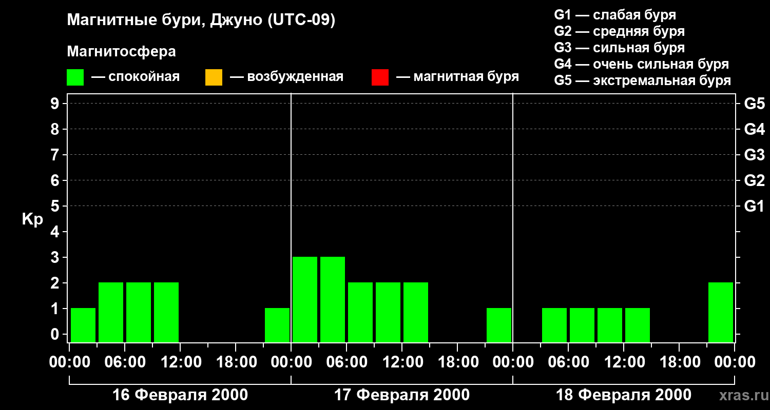 Изменения геомагнитного индекса Kp с 16 по 18 февраля 2000 года для средних широт