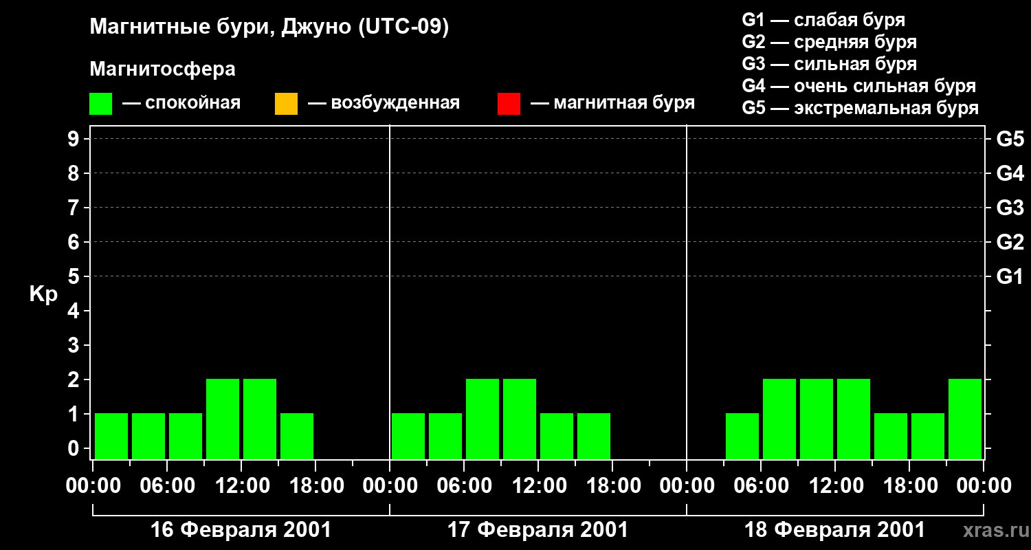 Изменения геомагнитного индекса Kp с 16 по 18 февраля 2001 года для средних широт