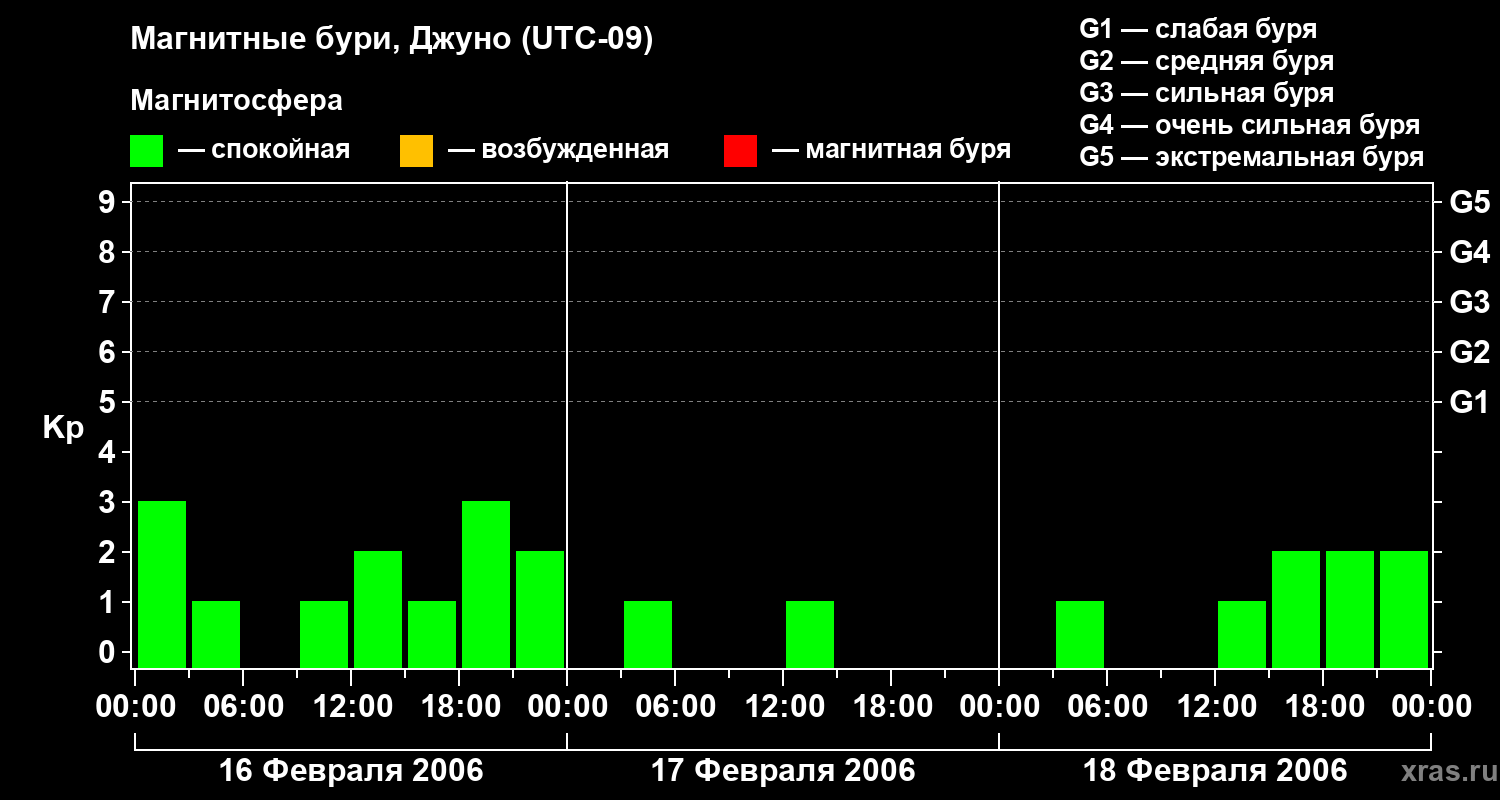 Изменения геомагнитного индекса Kp с 16 по 18 февраля 2006 года для средних широт