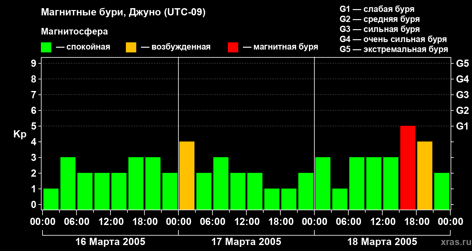 Изменения геомагнитного индекса Kp с 16 по 18 марта 2005 года для средних широт