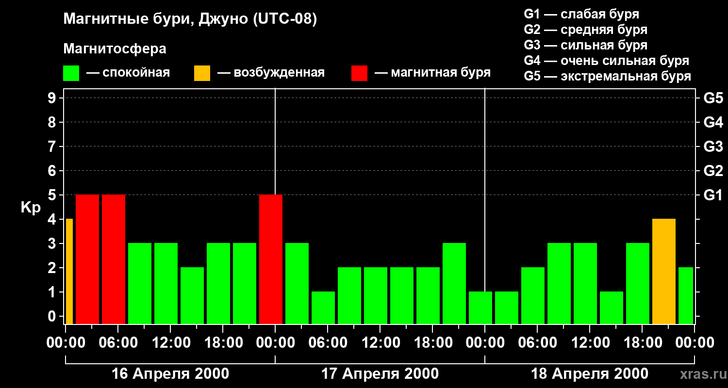 Изменения геомагнитного индекса Kp с 16 по 18 апреля 2000 года для средних широт