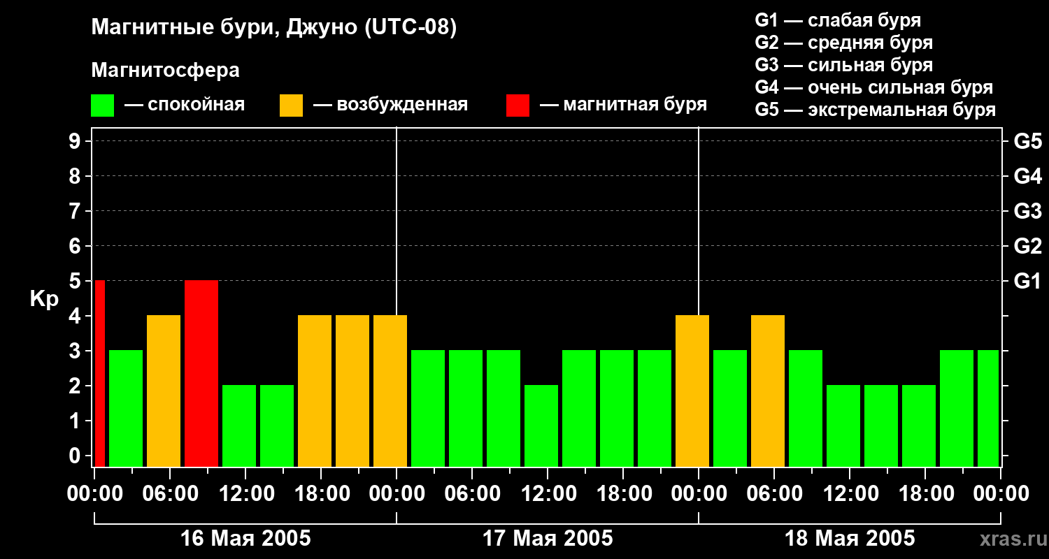 Изменения геомагнитного индекса Kp с 16 по 18 мая 2005 года для средних широт